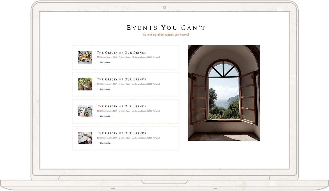 Event FeaturesUt enim ad minim veniam, quis nostrud Lorem ipsum dolor sit amet, consectetur adipiscing elit, sed do eiusmod tempor incididunt ut labore et dolore magna aliqua. Lectus arcu bibendum at varius. Ut porttitor leo a diam. Penatibus et magnis dis. See More